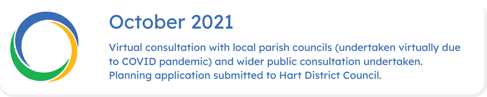 Engagement with the local community took place virtually via video conference due to restrictions imposed the COVID pandemic and no objections were received from the local parish councils. A leaflet drop was undertaken reaching out to local homes and businesses and their feedback helped to shape the final planning application package which was submitted to Hart District Council in October 2021.